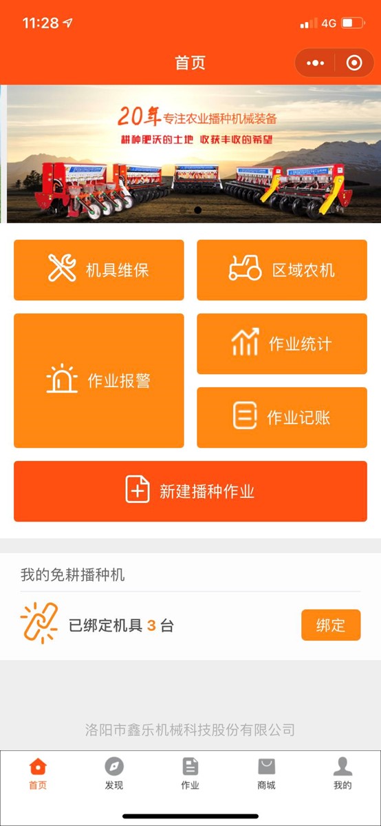 - 首頁:為登錄用戶提供創(chuàng)建作業(yè)、機具維保、區(qū)域農機、作業(yè)報警、作業(yè)統(tǒng)計及作業(yè)記賬等重點功能的快捷入口。